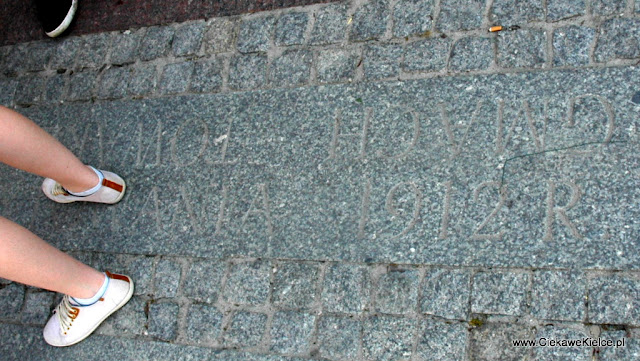 …oraz na chodniku, gdzie podczas remontu deptaka położono stylizowane na zabytkowe płyty z wykutym,  ledwie widocznym napisem GMACH TOWARZYSTWA WZAJEMNEGO KREDYTOWANIA 1912.