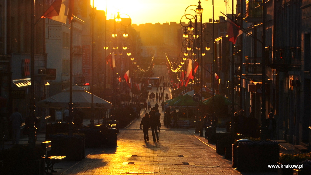 Na początku maja, gdy deptak udekorowany jest flagami na święta 1 i 3 Maja, słońce ciekawie podświetla lampy co wygląda, jakby świeciły za dnia…