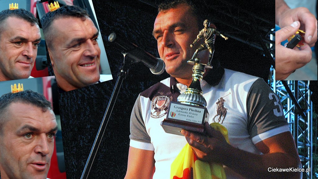…także dziś doszło do koronacji króla Korony ! Przed kamerą TVP zapytałem Grzegorza Piechnę wybranego na zawodnika 40-lecia Korony Kielce: czy jako król strzelców otrzymał kiedykolwiek koronę ? Odpowiedział: nigdy ! Wręczyłem mu zatem Koronę Kielc… Jak zwykle spontaniczny, od razu położył ją sobie na głowie. Uznał, że to znakomity symbol miasta, ciekawa pamiątka, wręcz… ukoronowanie jego kariery w Koronie Kielce :-)