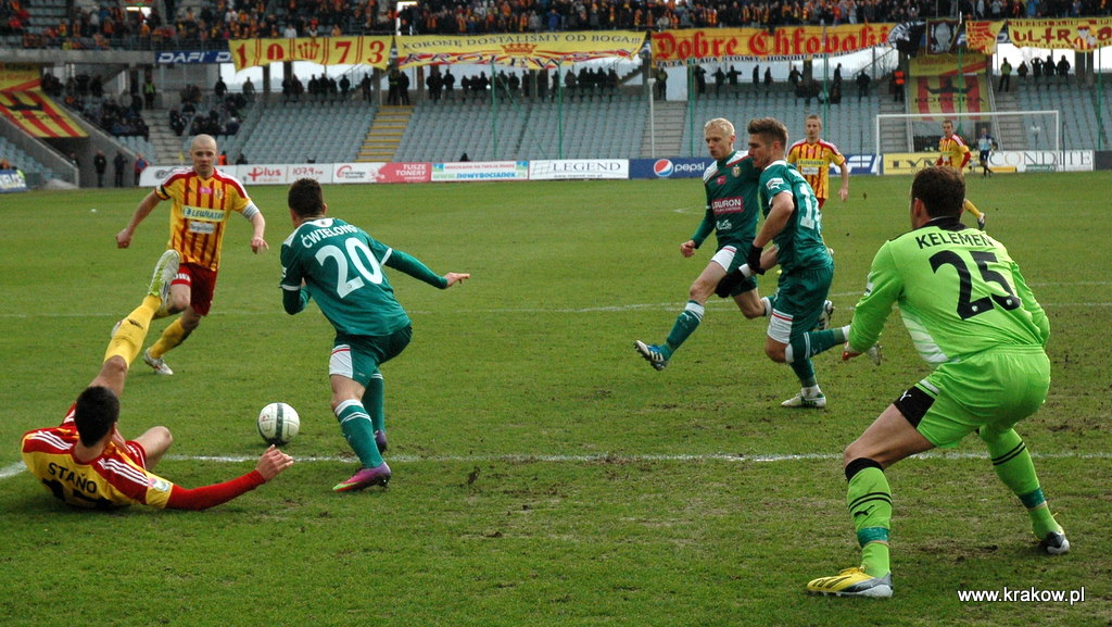 Tak padła jedyna bramka dla Korony w meczu z mistrzem Polski Śląskiem Wrocław (strzelec zasłonięty ręką bramkarza)…..