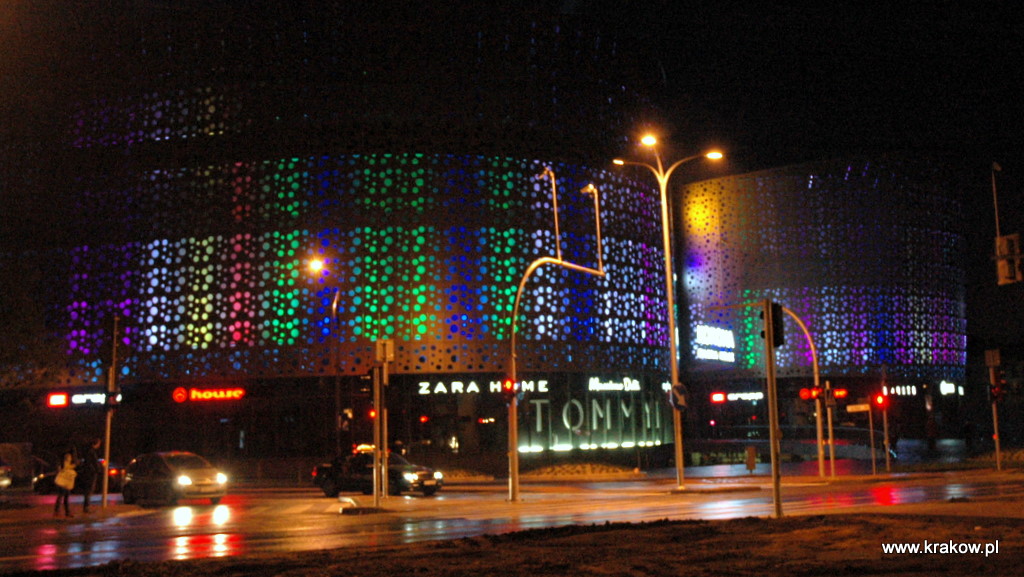 | Kolorystyka wieczornej iluminacji galerii wydaje się zbyt pstrokata, wystarczyłyby dwa kolory: żółty i czerwony |