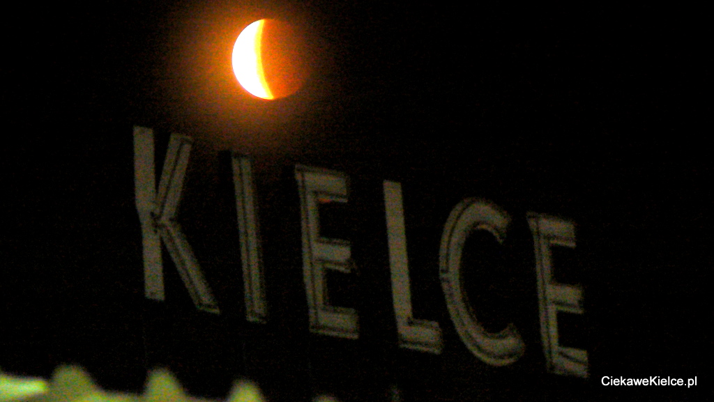 Dopiero przed północą udało mi się powtórzyć ujęcie, za które 14 lat temu dostałem wyróżnienie w konkursie fotograficznym „Gazety Wyborczej”, też na temat całkowitego zaćmienia Księżyca. Wtedy zdjęcie uwiarygadniał czynny wówczas zegar dworcowy z dokładną godziną. Dziś w fazie całkowitego zaćmienia Księżyc był niewidoczny z za chmur, dlatego powyższe zdjęcie przedstawia późniejszą fazę zjawiska.