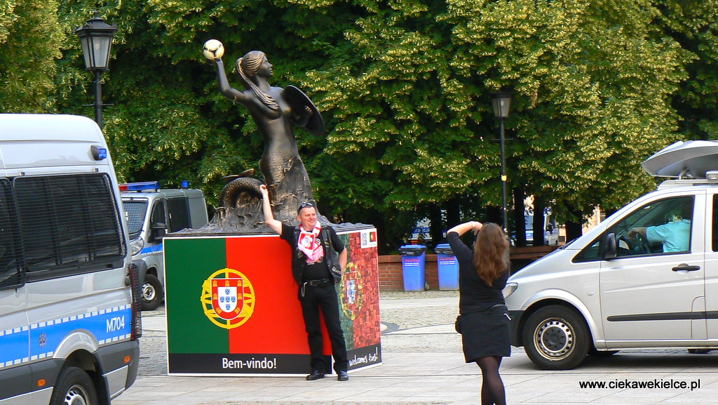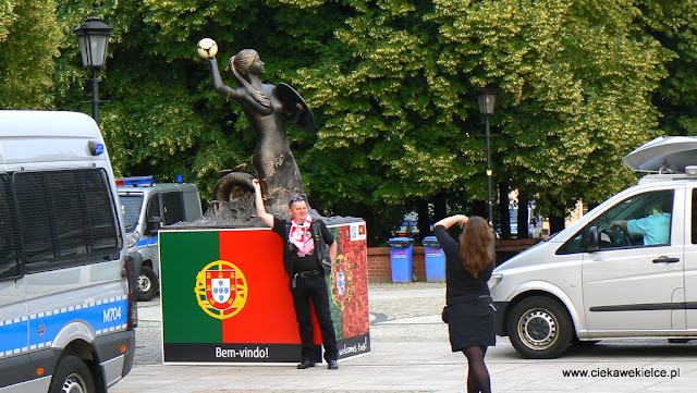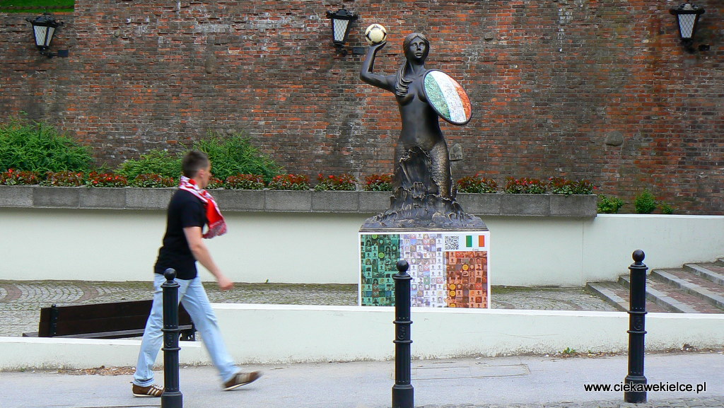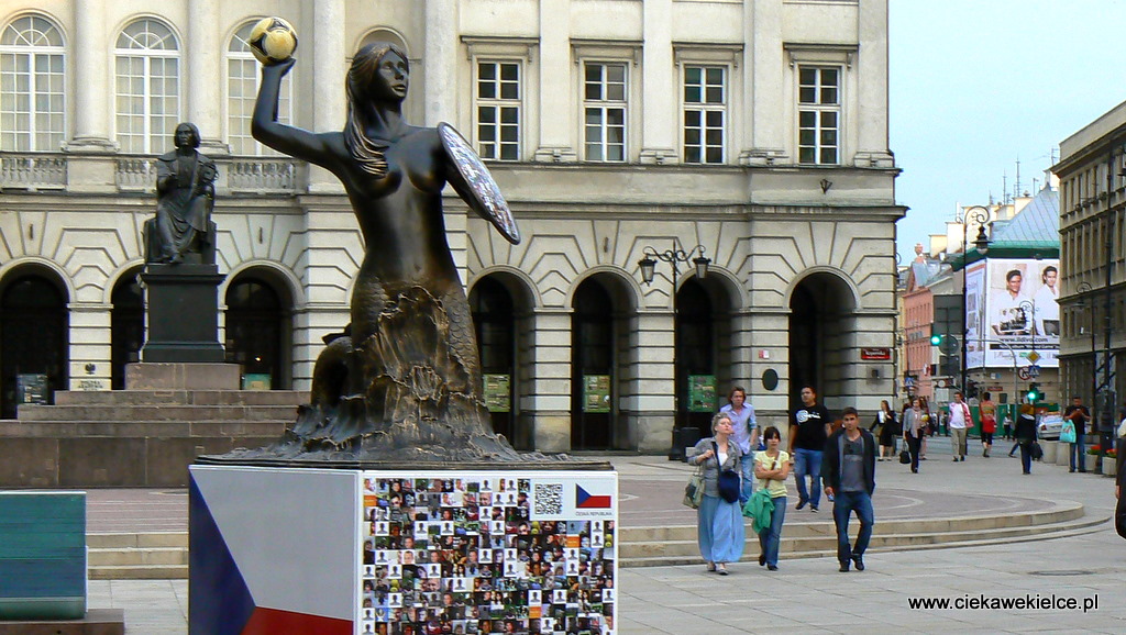 | Normalnie scena jak z czeskiego filmu: czeska syrenka z piłką, a w tle Kopernik z układem słonecznym, nie warszawskim, choć przyszło nam grać w grupie: Lech, Czech, Rus i… Zeus |
